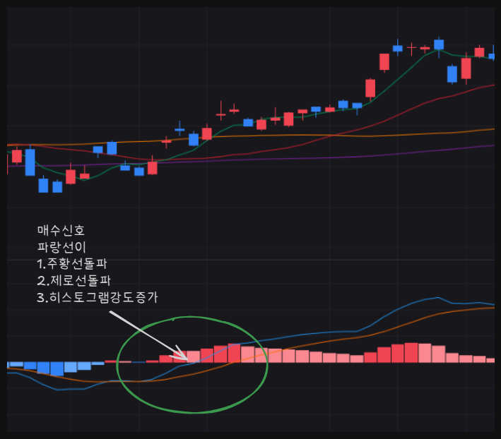 - 파랑선(MACD 선)이 주황선(시그널 선)을 돌파
