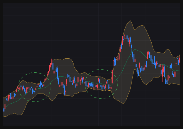 📌 위 차트를 보면, 초록색 원으로 표시된 구간에서 볼린저 밴드가 좁아지고 있는 것이 보입니다.