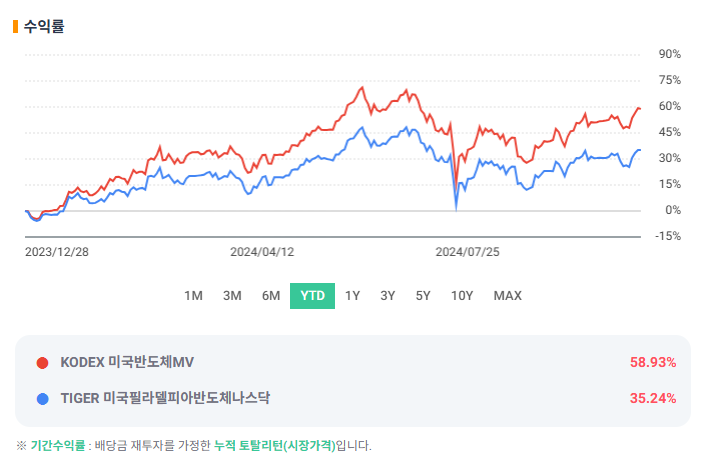 지난 1년 동안 두 ETF 모두 반도체 시장에서 좋은 성과를 기록했지만, KODEX 미국반도체 MV가 TIGER 필라델피아반도체나스닥보다 더 높은 수익률을 보였습니다.