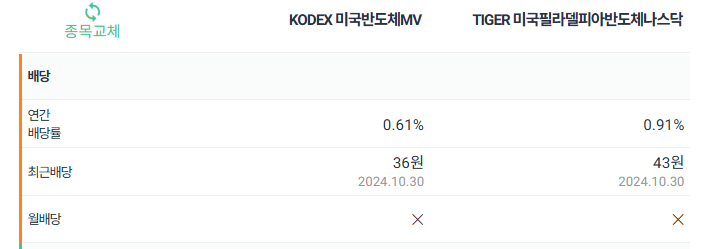 KODEX 미국반도체 MV는 연간 배당률이 0.61%, TIGER 필라델피아반도체는 0.91%로 약간 더 높은 수준이에요.