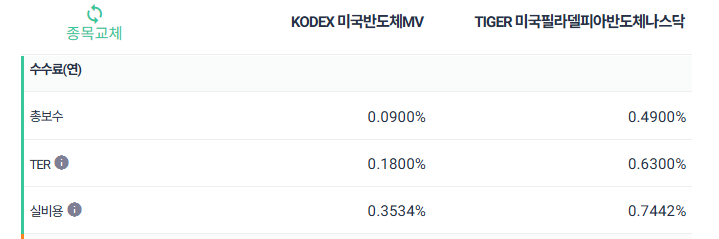 KODEX 미국반도체 MV는 총보수와 실비용이 더 낮은 편이라, 장기 투자 관점에서 비용 부담이 적어요.