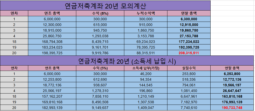 20년 동안 연금저축계좌를 운용한 결과를 예로 들어볼게요:
