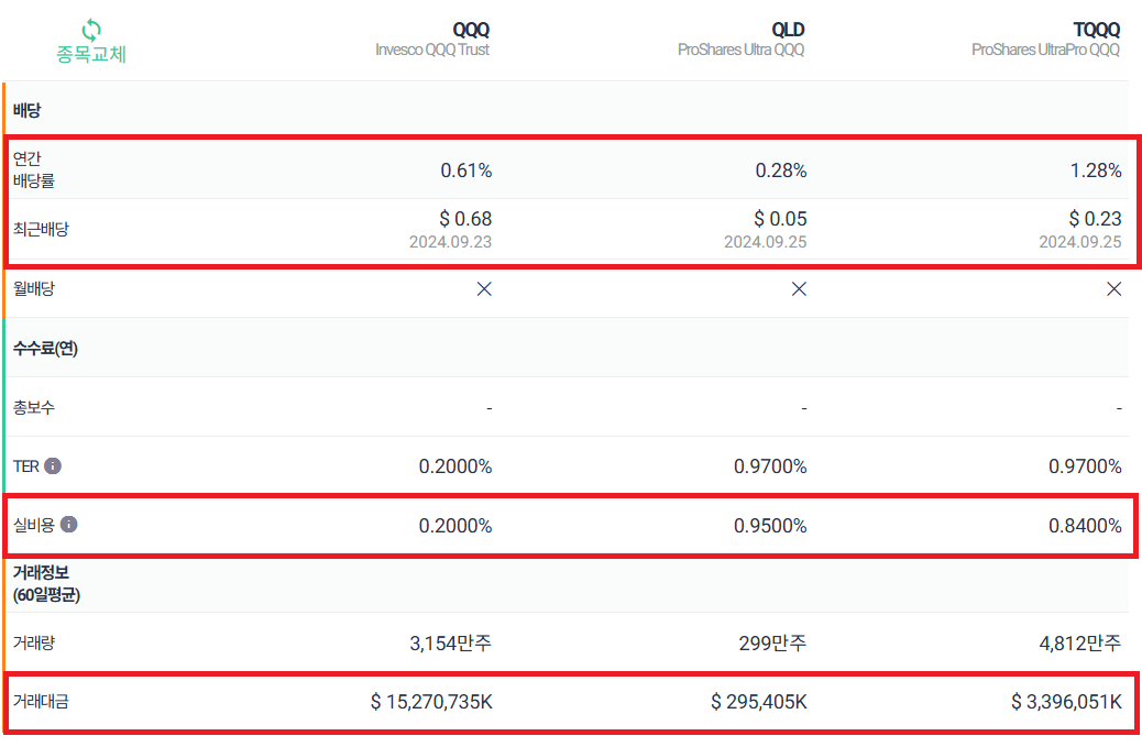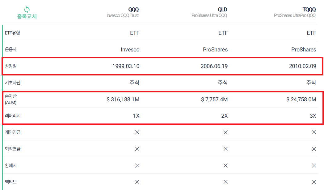 | 기본 특징 | 안정적인 나스닥 100 지수 추종 | 나스닥 100 지수의 2배 성과 | 나스닥 100 지수의 3배 성과 |