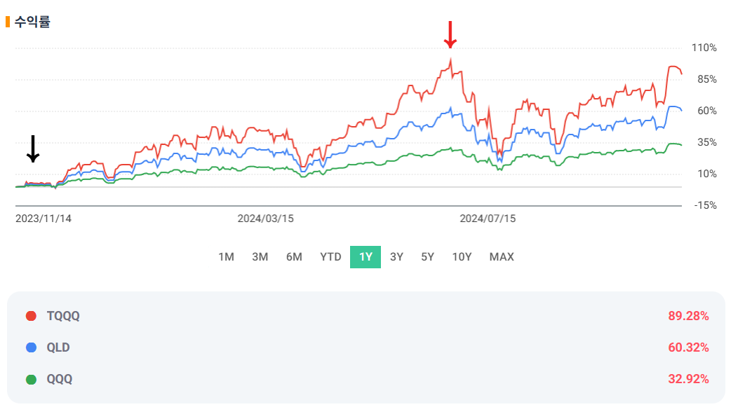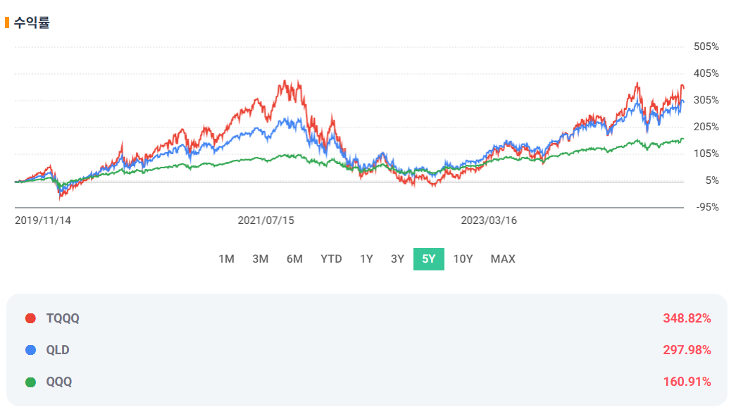 👉 성과를 극대화하고 싶다면 QLD나 TQQQ가 적합합니다.
