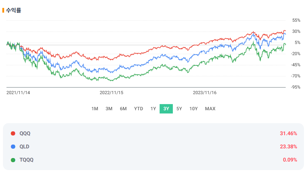지난 3년간 QQQ(나스닥 100 지수 추종), QLD(2배 레버리지), TQQQ(3배 레버리지)의 성과를 비교한 결과는 흥미롭습니다.