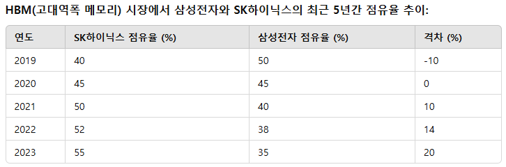 - 2023년 점유율: SK하이닉스 55%, 삼성전자 35% (격차 20%).