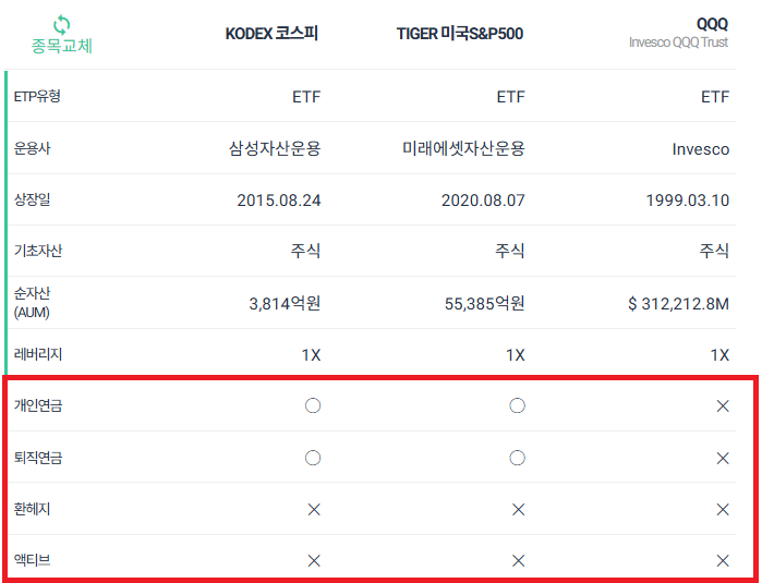 - 예: TIGER 미국S&P500, KODEX 나스닥100TR