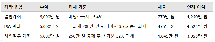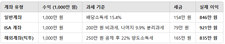 - 일반계좌는 금융소득(배당+이자)이 연간 2,000만 원 초과 시 종합과세 대상이 되어, 소득세 부담이 더 커질 수 있습니다.