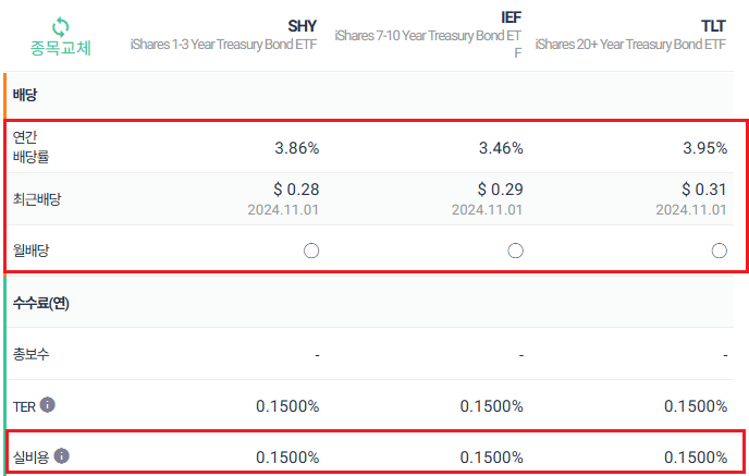 이 표는 SHY, IEF, TLT의 배당 정보와 수수료(Total Expense Ratio, TER)를 비교한 내용입니다.