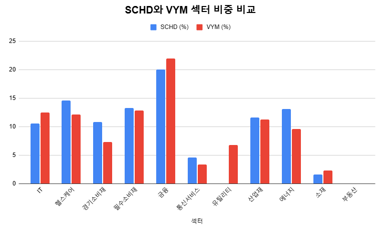 - 특히 금융 섹터에서는 SCHD(20.03%)와 VYM(21.98%) 모두 가장 높은 비중을 차지하며, 투자자들에게 안정적인 배당 수익을 제공하기 위한 목적이 엿보입니다.