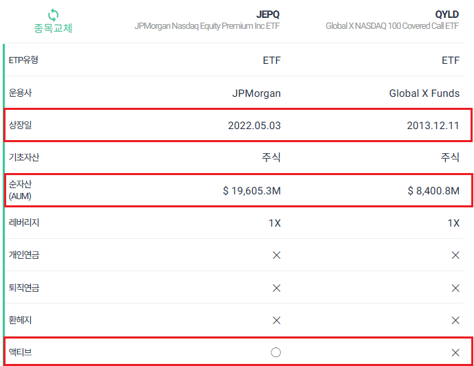 JEPQ와 QYLD, 둘은 모두 커버드콜 ETF라는 공통점을 가지고 있지만, 📈 상장일, 순자산(AUM), 그리고 운용 방식에서 확연히 다른 모습을 보여줍니다. 🤔✨