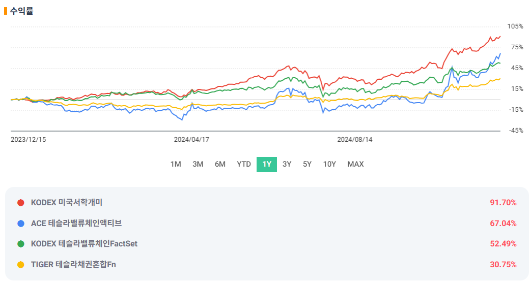 - 수익률: 테슬라의 폭발적인 상승세에 힘입어 압도적 1위!