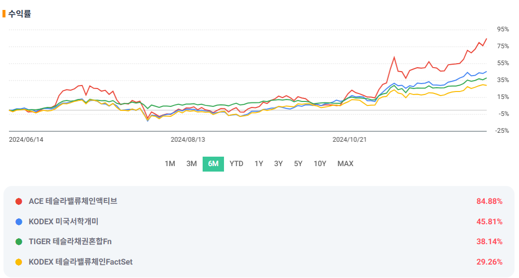 - 비하인드 스토리: 최근 6개월 동안 테슬라가 급등하면서 ACE가 가장 빠르게 치고 나갔습니다. 1년 성과는 조금 부족하지만, 최근 성장은 ACE의 독무대였습니다.