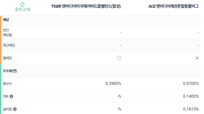 ETF 시장에 새로운 바람이 불고 있습니다! 바로 TIGER 엔비디아미국채커버드콜밸런스(합성) (A0000D0)의 등장입니다. 🌟 신상품은 기존 상품과 차별화된 전략과 강점으로 주목받고 있죠. 기존의 상품인 ACE 엔비디아채권혼합블룸버그(448540)와 비교해보겠습니다.