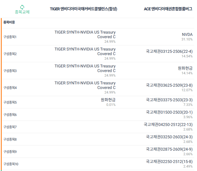 두 ETF 모두 엔비디아 주식을 30% 비중으로 담으며 나머지 70%는 채권으로 구성됩니다. 여기까지는 비슷하지만, 핵심은 바로 채권 구성 전략의 차이입니다!