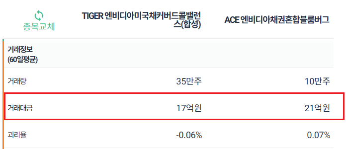 거래대금을 보면 TIGER 엔비디아미국채커버드콜밸런스(합성)이 상장 직후 빠르게 ACE 엔비디아채권혼합블룸버그를 따라잡고 있습니다.