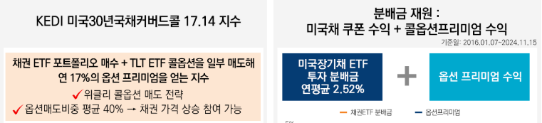- 채권 이자와 옵션 프리미엄을 결합해 매월 현금 흐름(분배금)을 지급하는 인컴형 ETF