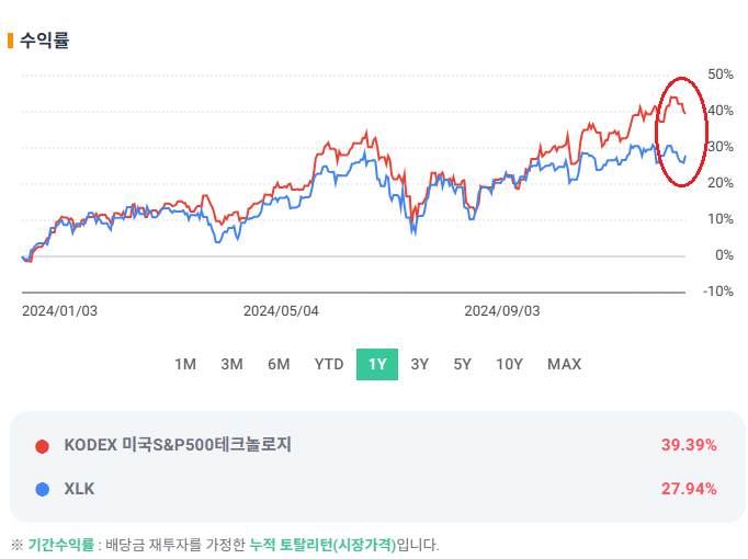 두 ETF 모두 S&P Technology Select Sector Index를 동일하게 추종하기 때문에, 1년 수익률 또한 IT 섹터의 성장을 반영하며 훌륭한 성과를 보여주었습니다. 달러 가치까지 고려했을 때, 더욱 매력적인 수익률을 기록한 것으로 보입니다. 💻📈