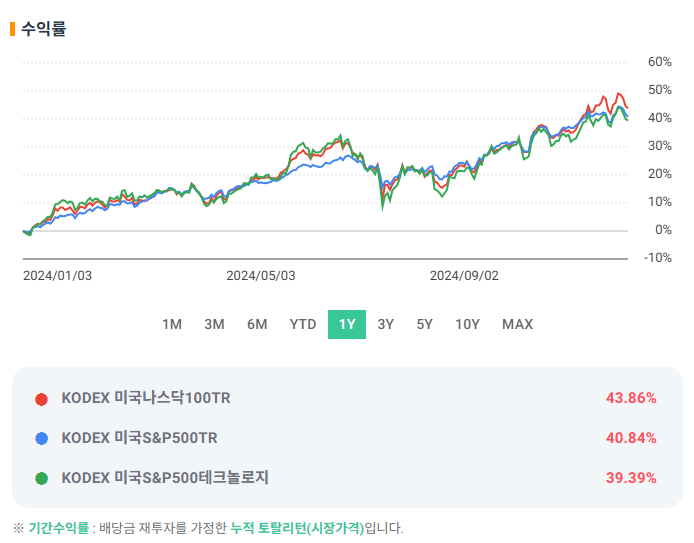 두 ETF는 다른 인기 상품들과 비교했을 때, 1년 수익률이 거의 비슷한 수준을 보여줬어요. 그런데, 이 중에서도 나스닥 중심 상품이 가장 높은 수익률을 기록했답니다. 🚀✨